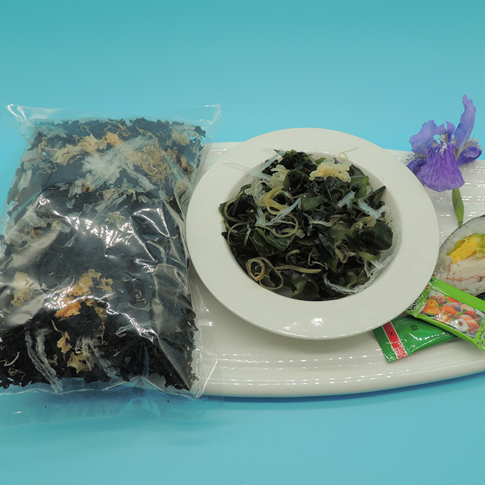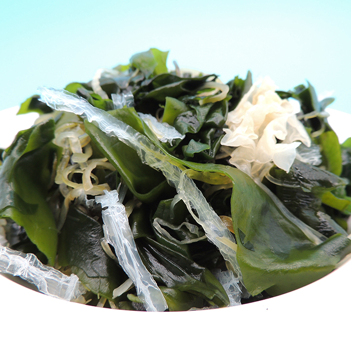 The dried seaweed is mainly dried wakame leaves, mixed with dried stalks, white fungus, agar, etc. The dry products are manually selected, cut into specifications, and then matched according to the required proportions. Convenient to eat. After opening the bag, soak in water. After the ingredients are completely watered, add salad dressing to make seaweed salad according to personal taste, or you can add other seasonings according to personal preference. Its characteristics are: easy to store, light, and flexible to master the taste according to your own requirements